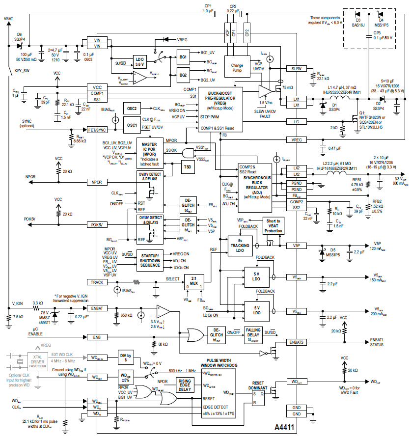 The A4411 offers a comprehensive power management solution for automotive applications, integrating a buck or buck-boost pre-regulator, a synchronous buck regulator, and multiple LDOs. It features a programmable watchdog timer, power-on reset, and fault protection for robust performance.