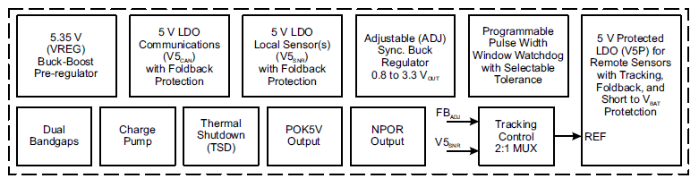 - Two 5 V LDOs for “local” sensors (V5SNR) and communications (V5CAN) with foldback short-circuit protections