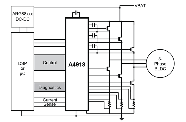 The A4918 is an N-channel power MOSFET driver capable of controlling MOSFETs connected in a 3-phase bridge arrangement and is specifically designed for automotive applications with high-power inductive loads, such as BLDC motors.