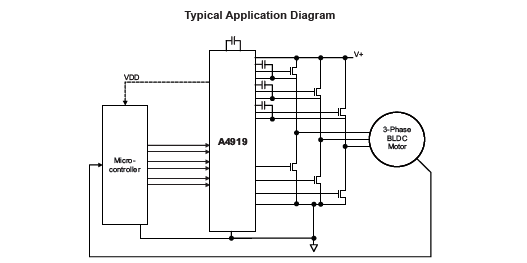 The A4919 is a versatile 3-phase MOSFET driver with an integrated regulator for simplified gate drive and includes comprehensive protection features and flexible control options for a wide range of motor applications.