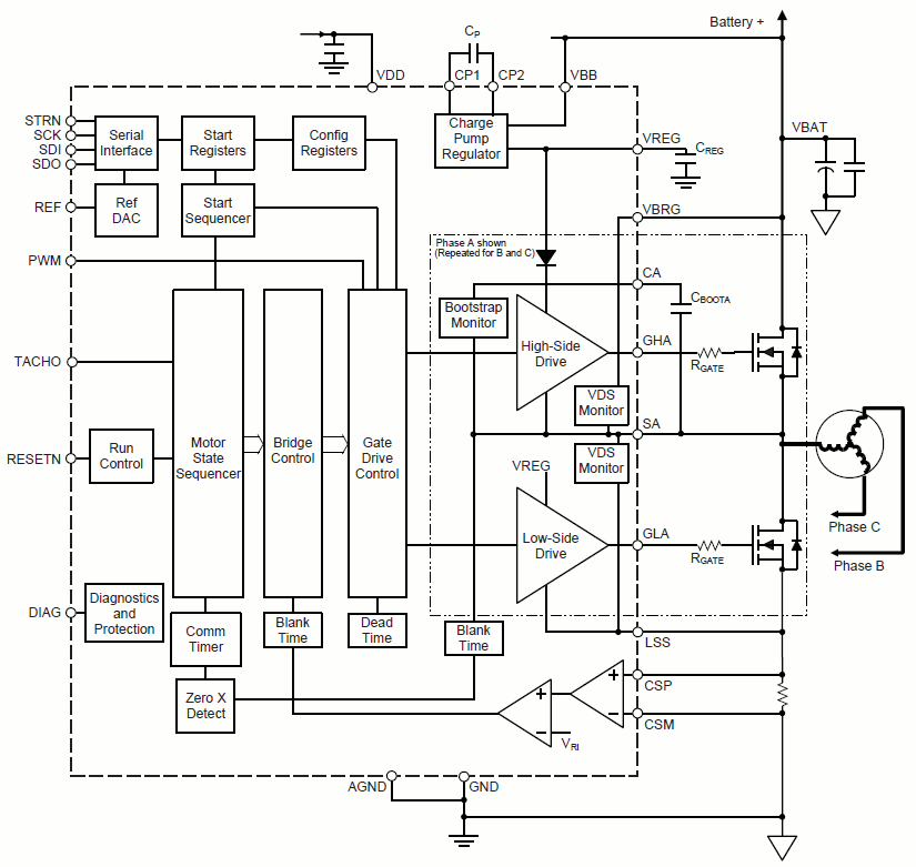 Automotive Sensorless BLDC Controller with Integrated Gate Drive and Diagnostics