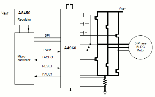 The A4960 offers a robust and efficient solution for automotive BLDC motor control, providing sensorless startup and commutation, integrated gate drive for N-channel MOSFETs, and comprehensive diagnostics for enhanced system reliability. Available in automotive and commercial grades.