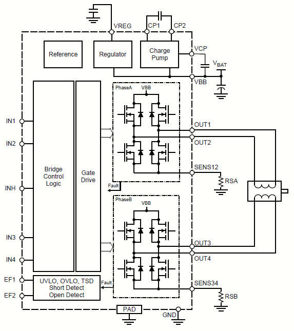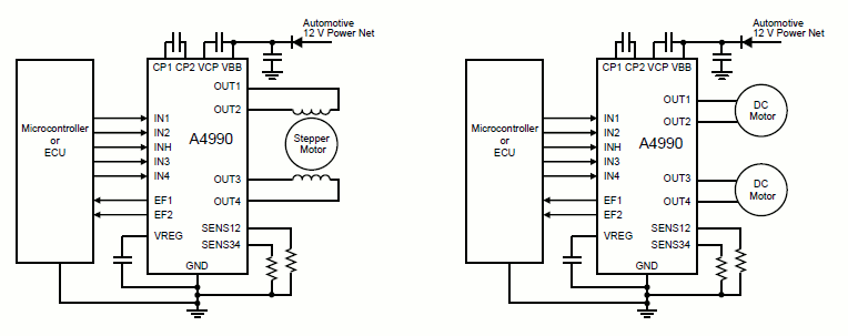 The A4990 provides versatile motor control for automotive applications, driving stepper or brush DC motors with full current and offering brake capability.