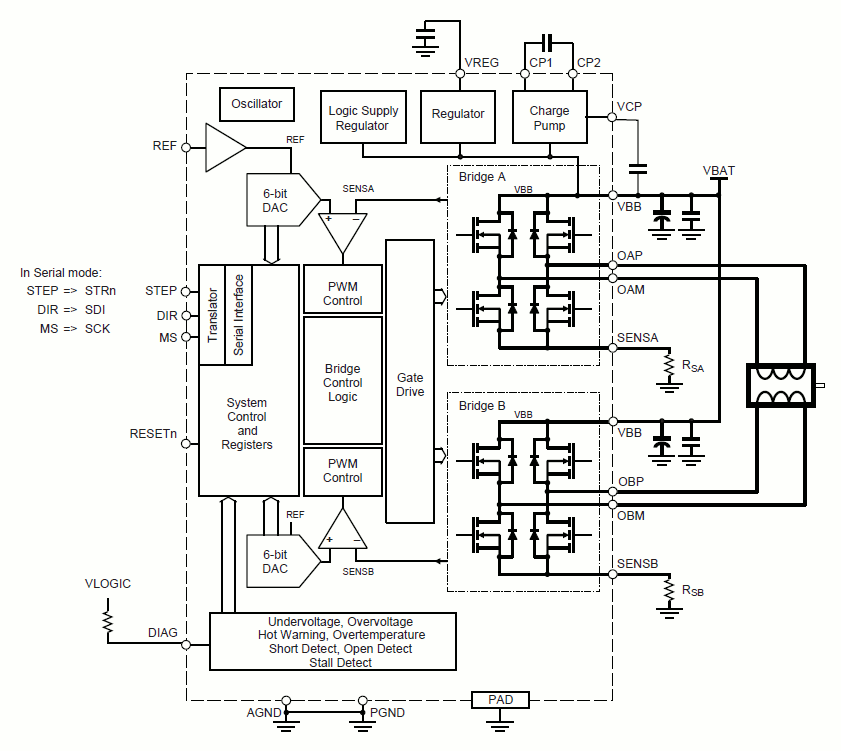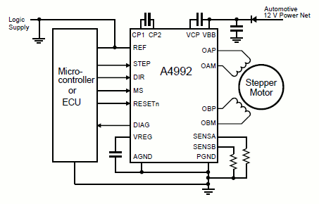 The A4992 simplifies stepper motor control with integrated phase current control, a built-in translator for easy microstepping, and adaptive mixed current decay for quiet and efficient operation.