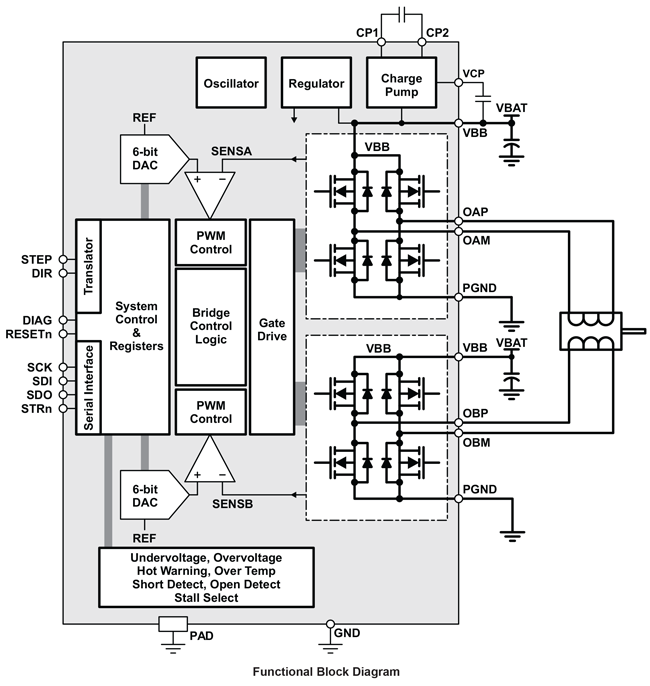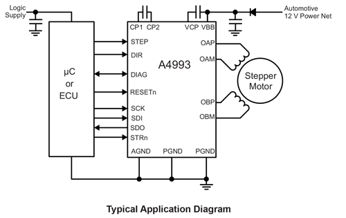 The A4993 offers flexible and precise control of bipolar stepper motors, with integrated phase current control, a built-in translator for easy microstepping, and SPI control for advanced configuration and diagnostics.