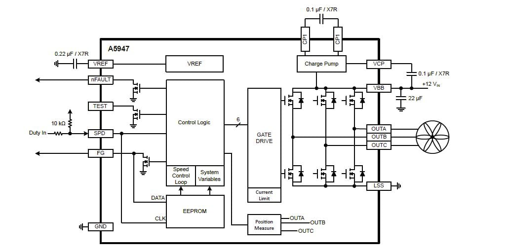 The A5947 simplifies the design of sensorless automotive fan systems with its integrated closed-loop speed control, sinusoidal drive, and programmable speed curves. Eliminates the need for a microcontroller and reduces PCB space.