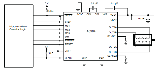 The A5984 offers quiet and precise control of stepper motors, featuring adaptive current control to minimize noise and vibration, along with an integrated translator and selectable step modes for simplified design.