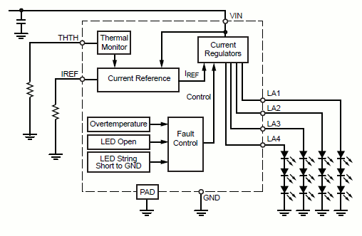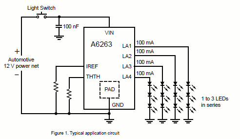 The A6263 provides robust and reliable LED driving for automotive applications, featuring four independent outputs, programmable current, and advanced protection features (short-to-ground, open LED, overtemperature) for enhanced safety.
