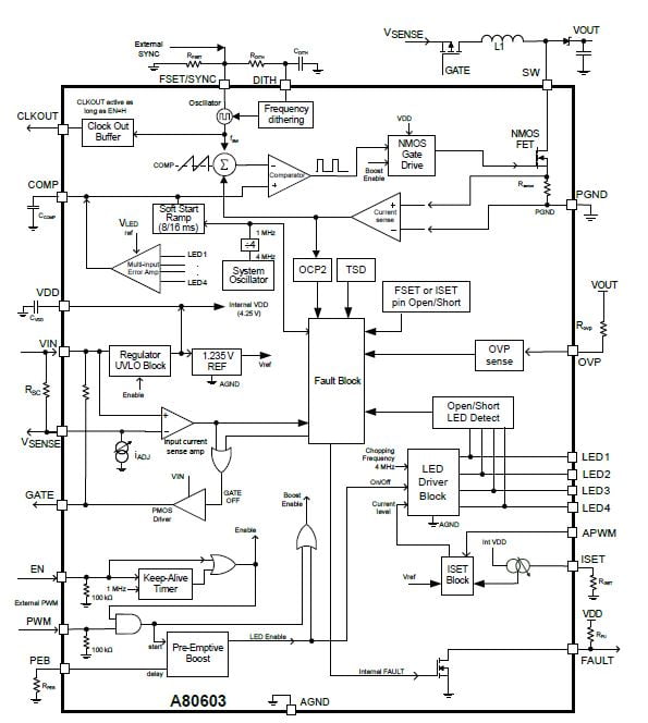 The A80603 simplifies LED driver design with an integrated boost converter and four current sinks, providing ultra-high dimming ratios and low output ripple. Offers flexible boost/SEPIC operation and extensive protection. The A80603-1 offers a modified programming range for PEB control, optimized for lower boost switching frequencies.