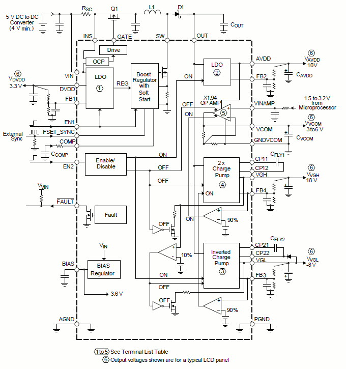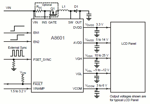 The A8601 simplifies LCD bias voltage generation, providing five independently adjustable outputs, programmable switching frequency, and pre-programmed power-up/down sequencing.