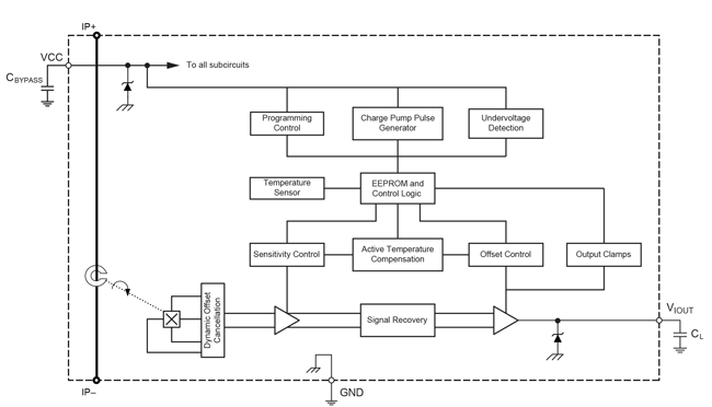 - Integrated shield greatly reduces capacitive coupling from current conductor to die due to high dV/dt signals, and prevents offset drift in high-side, high-voltage applications