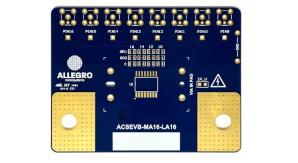 This bare evaluation board offers a method for evaluating Allegro current sensors in a lab environment. This MA/LA current sensor evaluation board (ACSEVB-MA16-LA16, TED-0004111) is intended for use with any MA-16 or LA-16 package (16-pin SOIC-W) Allegro Hall-based or TMR based current sensors.