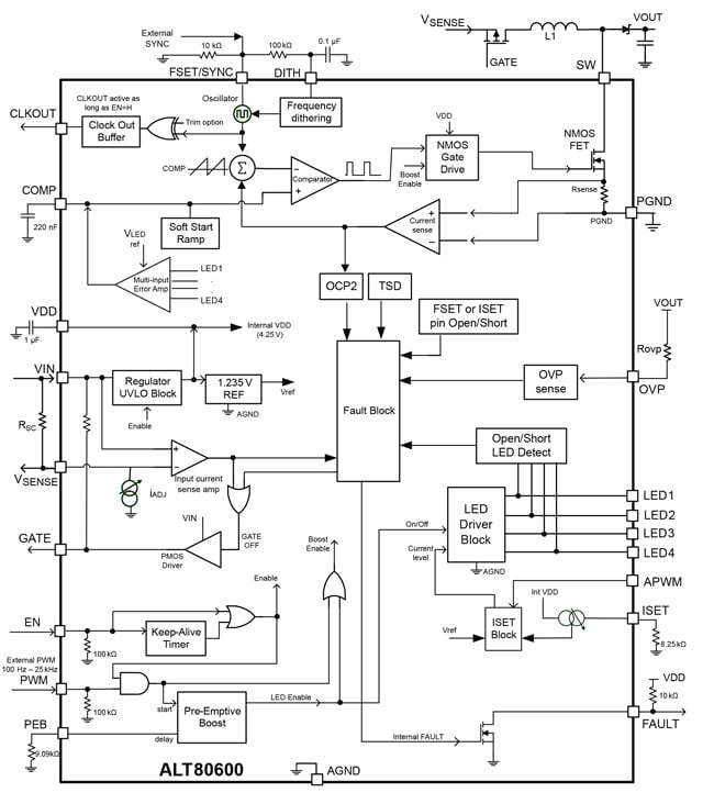 - Fully integrated LED current sinks and boost converter with internal power MOSFET