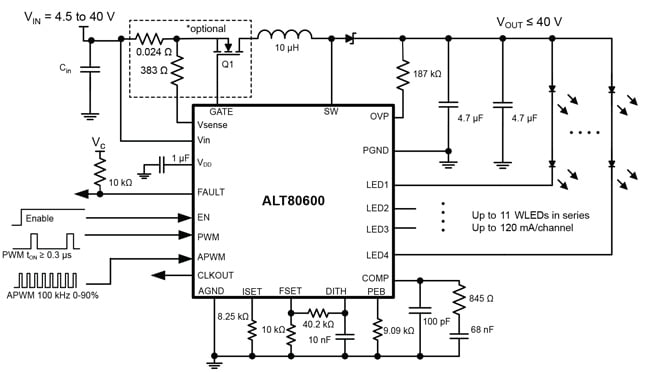 - Drives up to 11 series white LED in 4 parallel strings, at up to 120 mA per string (VF = 3.3 V max).