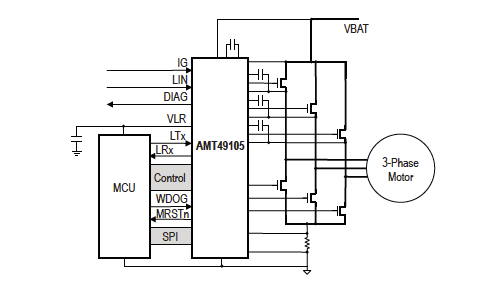 The AMT49105 integrates key functionality for automotive motor drive systems, including a 3-phase MOSFET driver, LIN interface, regulated microprocessor supply, and comprehensive diagnostics for simplified design and enhanced system reliability.