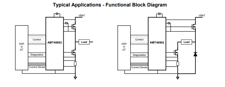 The AMT49502 offers a robust and reliable gate drive solution for automotive applications, with ASIL compliance, integrated diagnostics, and a wide operating voltage range (5.5V-80V) for use in both 12V and 48V systems.