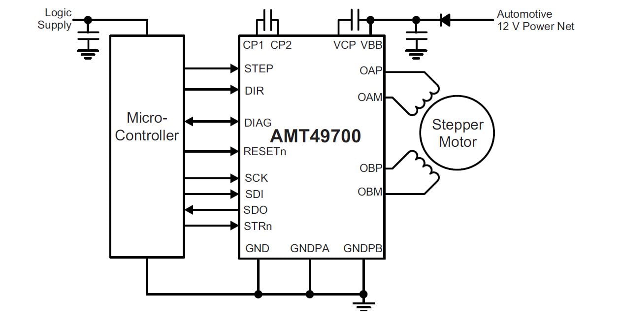 The AMT49700 simplifies complex stepper motor control with its programmable motion profiles, integrated current sensing, and microstepping capabilities, reducing microprocessor overhead and external component count.