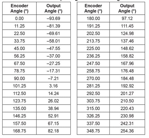 Initial data on the sensor angular output must be captured by the user. This is done by setting certain known angles, referred to as encoder angles in this document. Then the sensor angles are recorded. The sensor angles are the angles measured by the sensor. The number of points recorded can be more or less than the number of linear correction points. Recording more points, if possible, is always better.