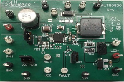 The ALT80800 Evaluation Board is designed to help system designers evaluate the operation and performance of the ALT80800 2.0 A synchronous buck LED driver. The regulated output current is easily configurable to 1 A or 1.5 A, with additional control by applying external analog dimming (ADIM) and/or PWM signals. The maximum forward voltage drop of the driven LED string is limited by VIN.