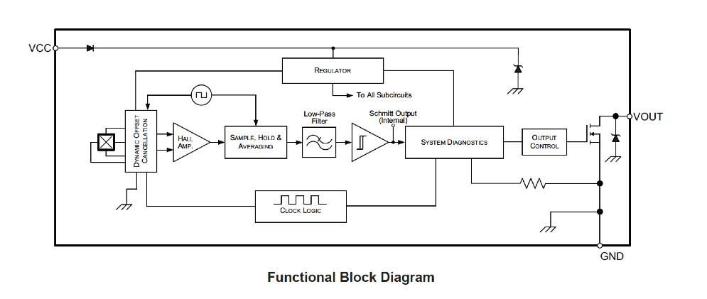- Integrated background diagnostics for signal path, regulator, Hall plate and bias, overtemperature detection, and nonvolatile memory