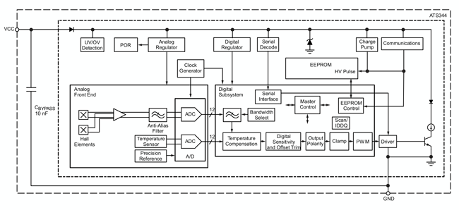 The ATS344 provides highly accurate and customizable linear position sensing, featuring a two-wire PWM output, integrated EEPROM for flexible programming, and an integrated rare-earth pellet package for simplified design.