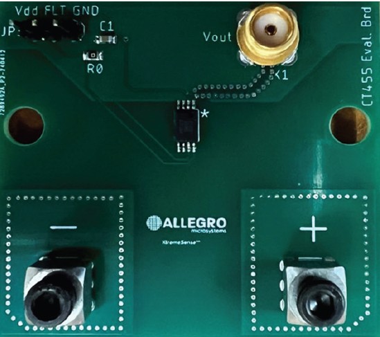 The Allegro CT455 evaluation board (CTD455) demonstrates the advantages of the CT455 high dV/dt optimized XtremeSense™ tunnel-magnetoresistance (TMR) coreless current sensor.