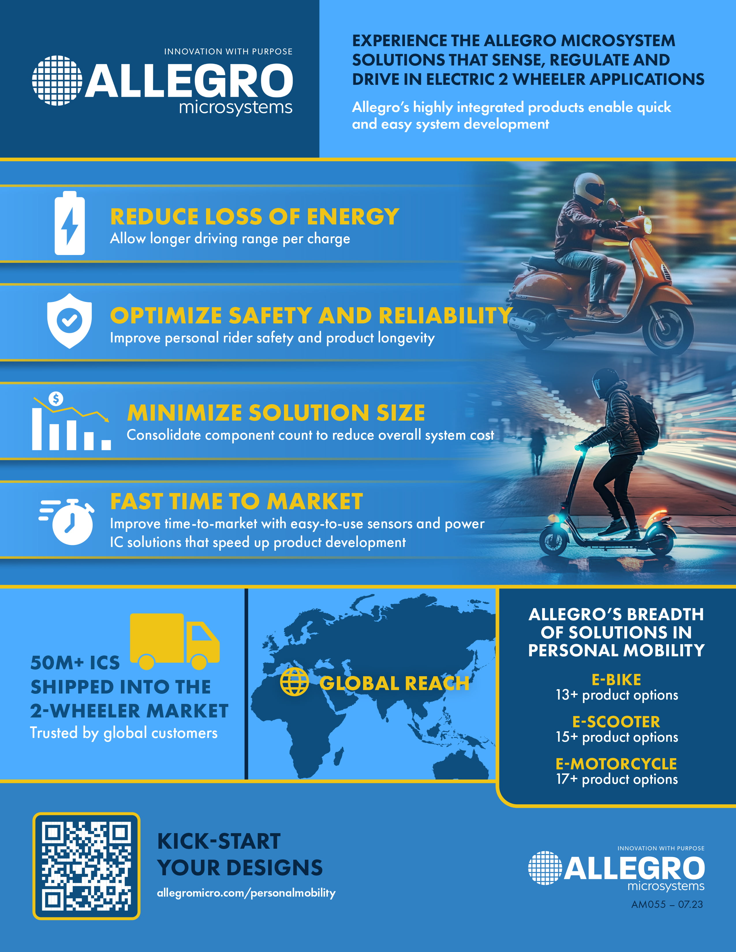 Enhance electric two-wheeler performance with Allegro’s efficient, easy-to-integrate motor drivers and sensors.